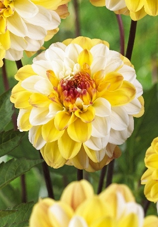 Цветок: Густомахровый, диаметр до 10 см, с ярким бордовым центром, желтыми и белыми секторами-лепестками, создающими эффект «градиентного» или «трехцветного» окраса.