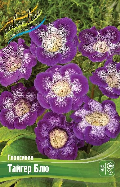 Глоксиния 'Тайгер Блю' (Gloxinia 'Tiger Blue') — это клубневое комнатное растение, ценящееся за свои крупные, бархатистые цветки-колокольчики белоснежного оттенка с широкой фиолетово-синей каймой и густым крапом.