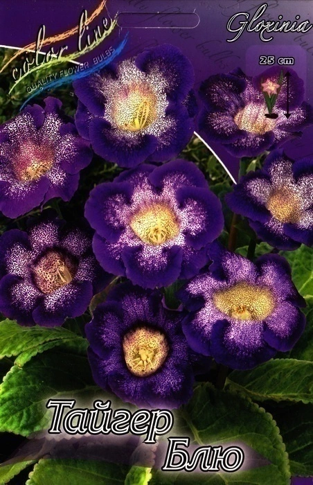 Глоксиния Тайгер Блю - является одним из самых привлекательных сортов. Это низкорослое растение, достигающее высоты 20-25 см. Кустик глоксинии обладает крупными листьями темно-зеленого цвета. Листья узорчатые, бархатистые и опушенные. Цветоносы глоксинии крепкие и высокие. Период ее цветения приходится на май-сентябрь. Цветки имеют форму колокола и отличаются большим размером – около 10-12 см в диаметре. Они белоснежные с фиолетово-синей каймой и таким же крапом. Горлышко цветка окрашено в лимонный цвет, а основная окраска представляет собой комбинацию белого и синего оттенков. Глоксиния Тигрина Блю является отличным растением для украшения интерьера жилой комнаты, балкона или лоджии. Период ее цветения приходится на май-сентябрь.