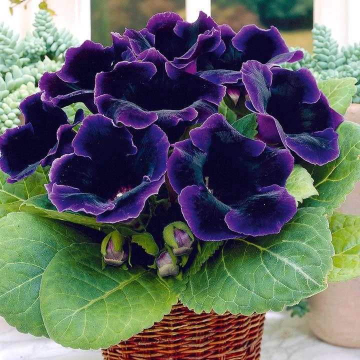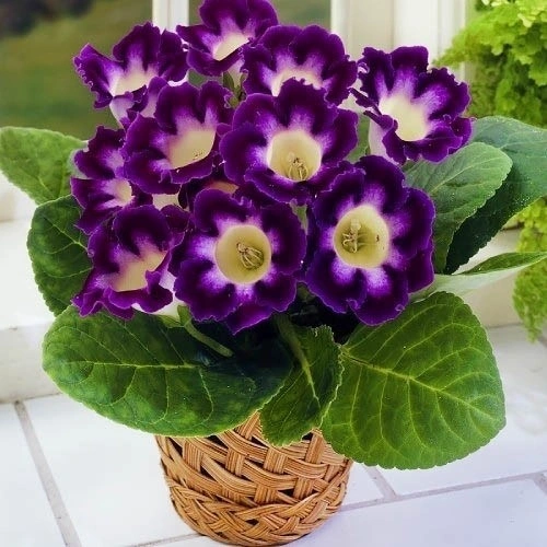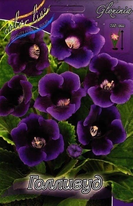Глоксиния Голливуд – великолепное компактное многолетнее растение, высотой не более 25 см, с крупными бархатистыми, блестящими, зелеными, слегка опушенными листьями мягкой овальной формы, имеющими серебристые прожилки. цветки имеют форму колокольчика и отличаются крупным размером – около 10 сантиметров. Они обладают фиолетово-фиалковой окраской с белым горлышком. На каждом растении формируется до 10 прекрасных цветков. Выращивают глоксинии чаще всего в качестве горшечной культуры. Также превосходно будут смотреться в подвесных кашпо. Период цветения с май-август.