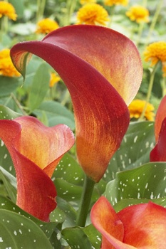 Калла 'Капитан Сафари' (Calla Captain Safari) — это многолетнее клубневое растение, ценящееся за свои яркие, желто-оранжево-розовые цветы и декоративные листья с белым крапом.