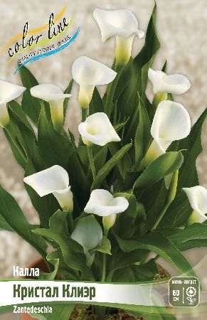 Калла 'Crystal Clear' — это многолетнее клубневое травянистое растение, отличающееся элегантными белоснежными цветками и используемое как для украшения сада, так и в качестве комнатного растения или срезанного цветка.