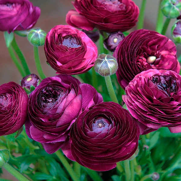 Ранункулюс сорта 'Purple' – это многолетнее клубневое растение с пышными, махровыми цветками насыщенного темно-лилового или пурпурного оттенка, напоминающими миниатюрные пионы или розы. Он отличается шелковистыми, блестящими лепестками и используется как для украшения сада, так и для срезки в букеты.