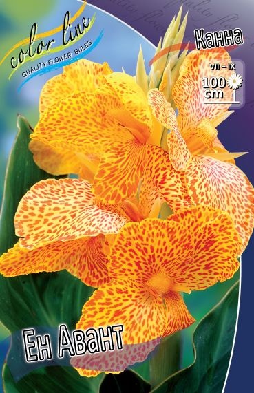 Канна сорта 'En Avant' – это многолетнее корневищное растение с яркими, желтыми цветками, усеянными красными или оранжевыми крапинками, и крупными декоративными листьями. Она ценится за свой экзотический вид и длительный период цветения.