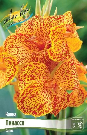 Канна 'Пикассо' — это эффектное многолетнее растение, известное своими яркими желтыми цветами с контрастными красными вкраплениями, напоминающими стиль живописи, и пышной зеленой листвой.
