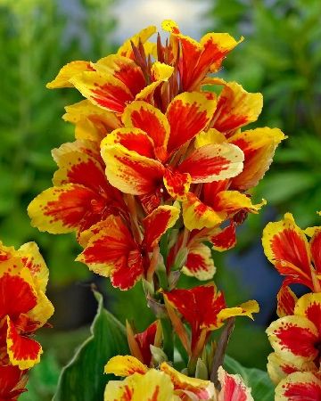 Цветки: Цветки оригинальные, двухцветные, асимметричные, собранные в верхушечные соцветия. Лепестки имеют широкие желтые края и яркие красные прожилки или мазки, идущие от центра цветка.