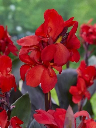 Канна Шайнинг Скарлет (Shining Scarlet) — это низкорослый (карликовый) декоративный сорт канны гибридной, отличающийся ярким контрастом между цветами и листвой.