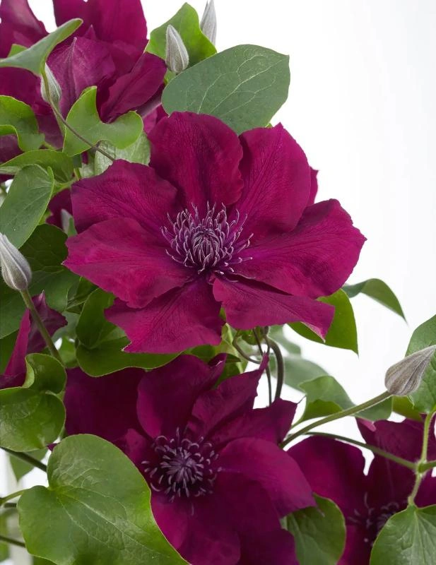 Клематис Вестерплатте— крупноцветковая кустарниковая лиана. Этот сорт принадлежит к группе обрезки 2 (слабая). Побеги вырастают 2-2,5 м в длину, стебли пластичные. Листья зелёные тройчатые. Эффектный сорт с искристыми, гранатово-красными, бархатистыми цветками диаметром 12-15 см, с красными пыльниками. Цветущие в два срока: в начале лета - на прошлогодних побегах, в конце - на побегах нынешнего года. Требует регулярного полива, подкормки; опоры для правильного роста. Клематис характеризуется высокой зимостойкостью, однако нуждается в дополнительном укрытии на зиму. Подходит для посадки у ограждений, стен, беседок, решёток, небольшим деревьям и кустарникам. Особенно хорош для выращивания в больших контейнерах на балконах и террасах.