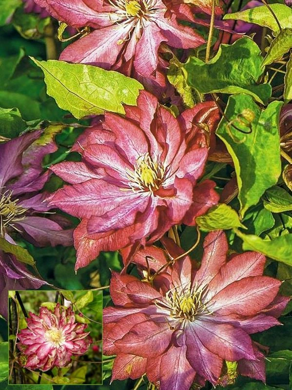 Клематис Каен - кустарниковая лиана. Группа обрезки слабая (2). Лиана вырастает до 2–2,5 м в длину. Листочки сочные ярко-зелёного цвета, удлинённые с заострённым кончиком. Цветки махровые и полумахровые, 12-15 см в диаметре. В бутонах зелёные, раскрываясь, постепенно меняют окраску до красно-розового цвета. Кончики лепестков заостренные, имеют более светлый тон. Этот сорт обладает непреходящей красотой и высокой выносливостью. Цветущие в два срока: в начале лета - на прошлогодних побегах, в конце - на побегах нынешнего года. Требует регулярного полива, подкормки; опоры для правильного роста. Клематис характеризуется высокой зимостойкостью, однако нуждается в дополнительном укрытии на зиму. Подходит для посадки у ограждений, стен, беседок, решёток, небольшим деревьям и кустарникам. Особенно хорош для выращивания в больших контейнерах на балконах и террасах.