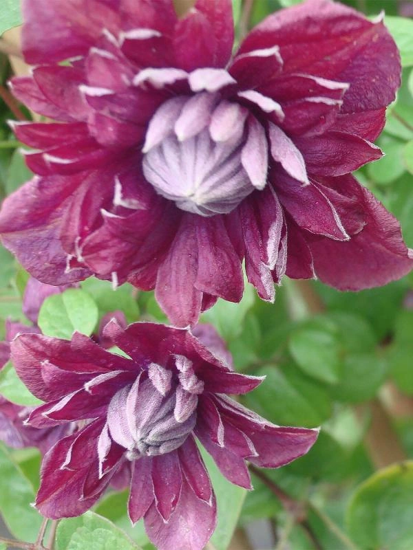 Клематис Пурпуреа Плена Элеганс — лианообразный многолетник с одревесневшими стеблями длиной до 3,5 м. Этот сорт принадлежит к группе обрезки 3 (сильная). Листовые пластины клематиса имеют правильную овальную форму и густо покрывают плетеобразные ветви. Цветки махровые, распускающиеся постепенно, в диаметре 6–8 см. Цвет — красновато-пурпурный с фиолетовым оттенком. Оттенок может меняться в зависимости от состава почвы и условий освещённости. В центре цветков — почти белый помпон из ещё не расправившихся (светлых с тыльной стороны) лепестков. За небольшой срок растение формирует густое и красивое зелёное покрытие, на котором красуется огромное количество мелких цветков. Период цветения июнь-сентябрь. Требует регулярного полива, подкормки; опоры для правильного роста. Клематис характеризуется высокой зимостойкостью, однако нуждается в дополнительном укрытии на зиму. Подходит для посадки у ограждений, стен, беседок, решёток, небольшим деревьям и кустарникам.