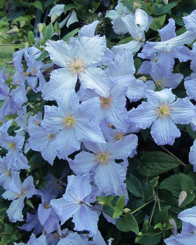 Клематис Блекитни Аниол - обильноцветущий сорт. Этот сорт принадлежит к группе обрезки 3 (сильная), вырастает до 2 м. Стебли вьются, хорошо цепляясь за опору. Листья у описываемого сорта широко ланцетовидные, с заострёнными кончиками, зеленые. Цветок в диаметре может достигать 6-8 см. Лепестки у цветов овальные и волнистые по краям. Он имеет голубоватый оттенок, с белой сердцевиной и жёлто-зелёными тычинками. Блекитни Аниол относят к среднецветущим растениям. Цветы начинают появляться на лианах в июне и полностью исчезают только в сентябре. Требует регулярного полива, подкормки; опоры для правильного роста. Клематис характеризуется высокой зимостойкостью, однако нуждается в дополнительном укрытии на зиму. Широко используется для посадки у небольших деревьев или кустарников, беседок и других опор. Может использоваться как почвопокровное растение.