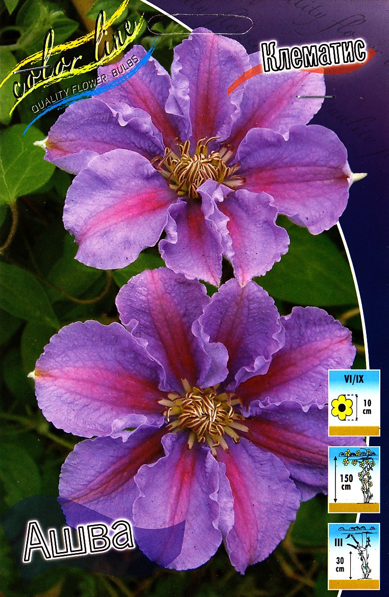 Клематис 'Ashva' — это компактный, обильно цветущий сорт литовской селекции с крупными пурпурно-фиолетовыми цветками, который отличается неприхотливостью и подходит для выращивания в контейнерах.