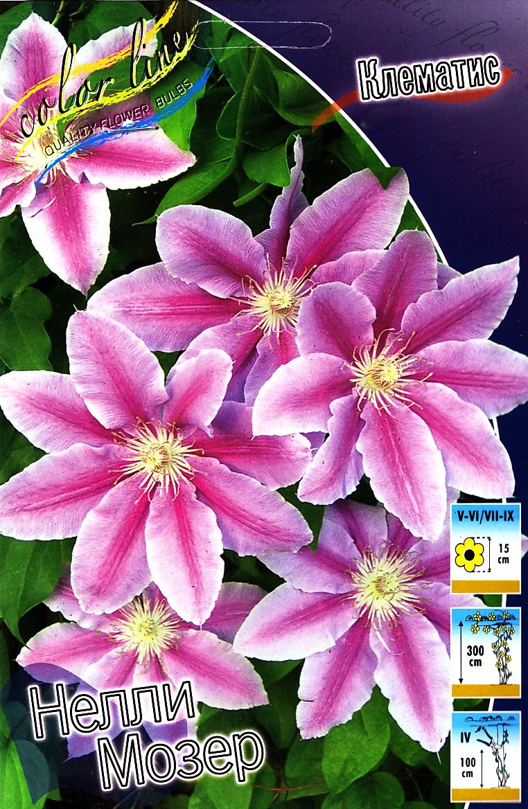 Клематис 'Nelly Moser' – это умереннорастущий крупноцветковый сорт, известный своими двухцветными цветками светло-розового или светло-фиолетово-розового окраса с выразительной малиново-красной полосой посередине лепестков и красными тычинками.