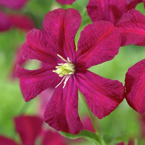 Цветки: Звездчатые, среднего размера (около 10 см в диаметре), насыщенного винно-красного или темно-бордового цвета, с кремово-желтыми или золотистыми тычинками в центре.