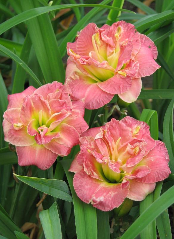 Лилейник гибридный Лейси Дойли - гибридный многолетний сорт. Высота растения — 50-60 см. Прикорневые листья линейные, ярко-зелёные. Бутоны состоят из множества воздушных лепестков, окрашенных в жемчужно-розовый цвет. На них просматриваются белые, жёлтые и персиковые вкрапления. Лепестки гофрированные по краям. В полном роспуске диаметр бутона 9-13 см. Период цветения июль-август. Лилейник один из самых неприхотливых многолетников, он зимостоек и засухоустойчив, прекрасно растёт на хорошо освещённых участках. Можно использовать для декоративного озеленения, создания бордюров или групповых посадок. А также прекрасно подходит для одиночных посадок или использования в альпинариях. Кроме того, его можно использовать для срезки цветков.