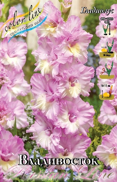 Гладиолус Владивосток, также известный как Vladivostok, является многолетним клубнелуковичным растением высотой от 90 до 120 см. Культура имеет прямостоячие стебли и зеленые простые листья. Цветки гигантских размеров, диаметром около 18 см и длиной соцветия в 45 см. Лепестки ванильные, обычно находятся в нижней части бутона, широкие, кремово-розового цвета. Края лепестков гофрированные, окраска нежно-фиолетовая с кремово-белой сердцевиной. Цветение происходит с июля-сентябрь. Требует выкапывания на зиму.