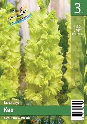 Гладиолус «Кио» — крупноцветковый сорт. Цветок светло-лаймовый. Растение высокое, стебель прямой и крепкий, листья узкие, линейные.