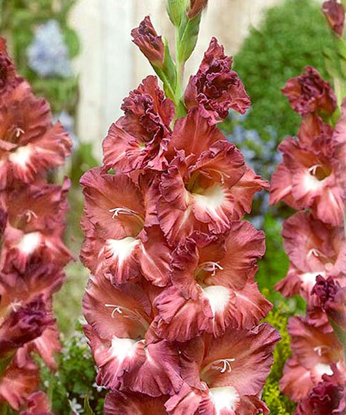 Гладиолус Босса Нова – это высокий, гигантский сорт гладиолуса (100-120 см), который имеет ровный и плотный цветонос. Листья мечевидные и яркого зеленого цвета. В соцветии может быть от 15 до 25 цветков, длина соцветия около 40 см. Диаметр цветка достигает до 18 см, а форма края лепестка гофрированная. Окраска варьируется от кремово-лиловой до кремово-бордовой. Цветение начинается в конце лета – в начале осени (поздний период). Продолжительность цветения составляет около месяца. Сажать гладиолусы этого сорта нужно в апреле-мае. Требует выкапывания на зиму.