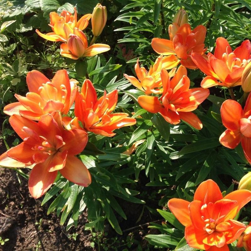 Лилия Оранж Твинс (Азиатский гибрид) – луковичное растение высотой 95-110см. Стебли светло зеленые с 5 цветками, листья очередные. Направленные вверх цветки – махровые, ярко оранжевые с редким крапом в центре, глянцевые, диаметром до 15см, без аромата. Цветет в июне – июле. Используют в групповых посадках, миксбордерах, клумбах и на срезку.