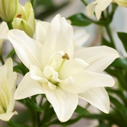 Лилия Belvedere имеет крупный махровый молочно-белый цветок без пыльцы. Высота растения 125 см. Цветки ароматные. Диаметр цветка 16 см. Время цветения июль-август.