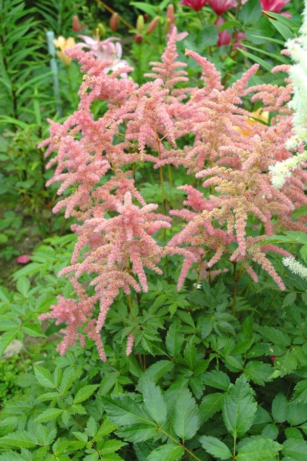 Астильба 'Брессингем Бьюти' (Astilbe arendsii 'Bressingham Beauty') — это красивый многолетний травянистый куст с нежно-розовыми, поникшими, метельчатыми соцветиями и ажурной темно-зеленой листвой.
