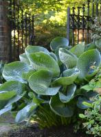 Хоста гибридная Абикуа Дринкинг Гаурд— травянистый многолетник высотой 60 см и шириной 1 м. Листья плотные, синие, чашеобразной формы, гофрированные, с глубокими рельефными полосками. Листовая поверхность округлой формы по краям сильно выгибается к верху так, что способна собирать дождевую воду. Цветки маленькие до 3 см, белёсые с лавандовыми нотками, расположенные на полуметровых стеблях сизоватого оттенка. Период цветения: июнь-июль. Используют для оформления бордюров или в качестве компаньона в групповой посадке. Реже используют в одиночных посадках. Хоста зимует без укрытия, хорошо переносит морозы.