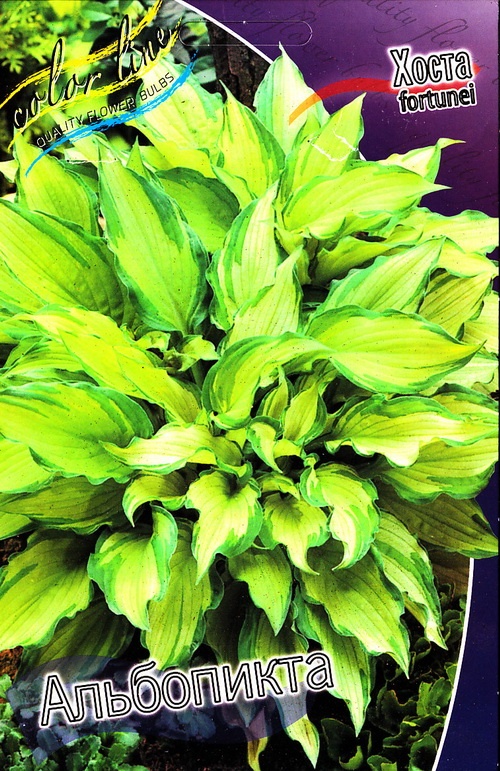 Хоста гибридная Альбопикта— травянистый многолетник высотой 60-70 см и шириной 100см. Крона хосты плотная и густая, листва с волнистыми или прямыми краями, иногда на ней просматривается восковой налёт. Длина листовой пластины до 25 см. Листья рифлёные, с меняющейся окраской. Молодые листья с ярко салатовым центром и зелёной каймой. К концу лета становятся зелёными. Цветки, собранные в соцветия в виде колокольчиков и воронок, светло-сиреневого цвета, ароматные, на высоких цветоносах. Цветение начинается в июле. Используют для оформления бордюров или в качестве компаньона в групповой посадке. Реже используют в одиночных посадках. Хоста зимует без укрытия, хорошо переносит морозы.