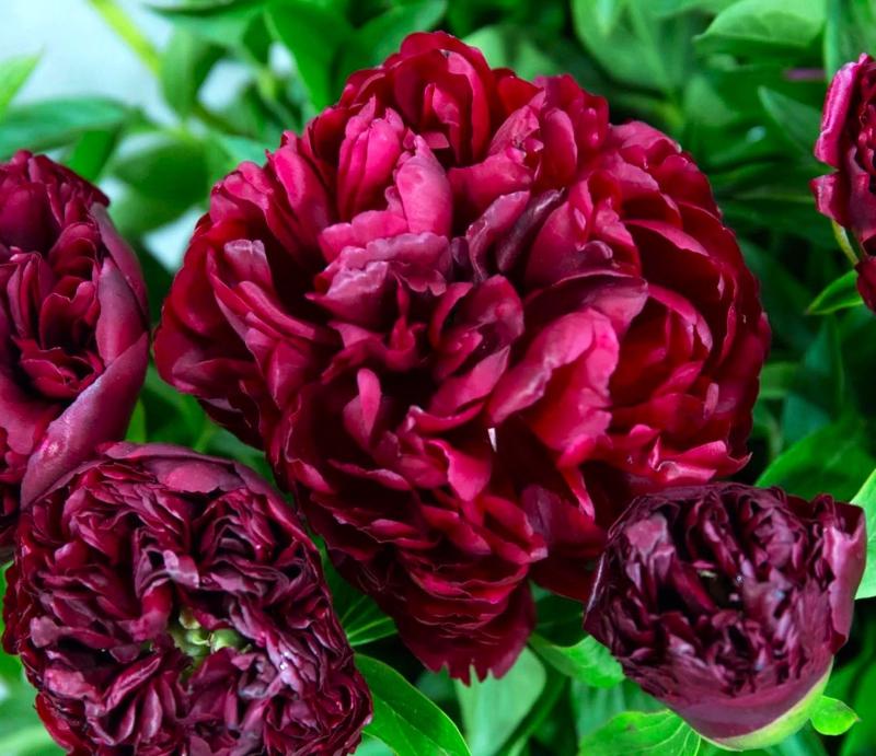 Травянистый пион с роскошными махровыми цветами насыщенного рубинового оттенка с выраженным атласным блеском. В центре цветка контрастно выделяются золотистые тычинки. К концу цветения лепестки приобретают оригинальный шоколадно-коричневый оттенок. Каждый прочный стебель несет до 3 бутонов, обеспечивая продолжительное цветение.