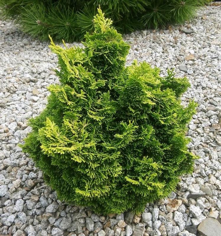 Ветви густые, слегка закручены по спирали, благодаря чему концевые веерообразные побеги придают «волнистость» и объём кроне. Лучше высаживать на открытых солнечных участках — при посадке в тени цвет хвои будет тусклее, а само растение — меньше.