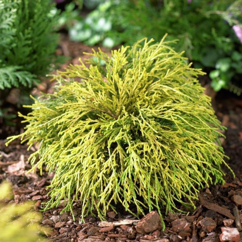 «Санголд» (Chamaecyparis pisifera Sungold) — карликовая форма кипарисовика горохоплодного. Название получил за яркий золотисто-лимонный прирост. Форма кроны: правильной сферической или ширококонической.