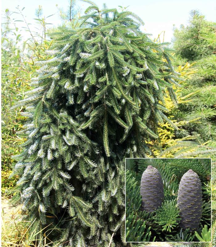 Плодоносит: шишками цилиндрической формы, молодые шишки — сизо-красные, позже становятся тёмно-фиолетовыми. Зимостойкость: зона 4 (от -34 до -29°C). Место: сильное солнце может навредить растению, поэтому для пихты лучше всего подойдёт полутень.