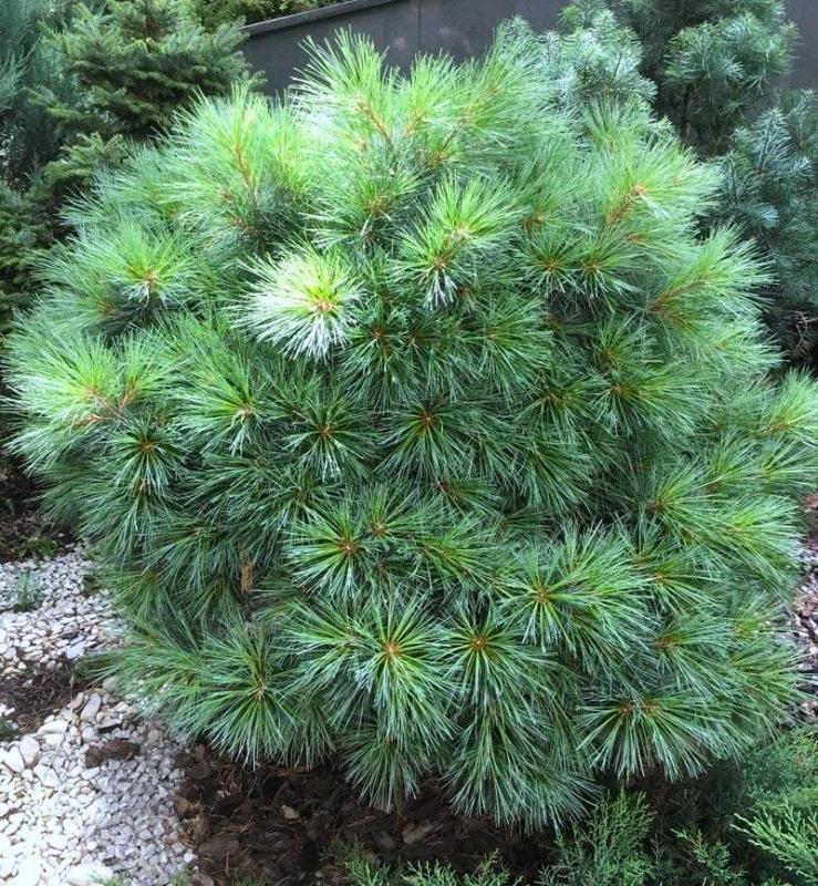 Сосна веймутова «Блю Шег» (Pinus strobus Blue Shag) подходит для выращивания на штамбе. Сорт карликовый, с плотной шаровидной, слегка приплюснутой кроной. Высота и диаметр взрослой сосны — около 1,2 м.