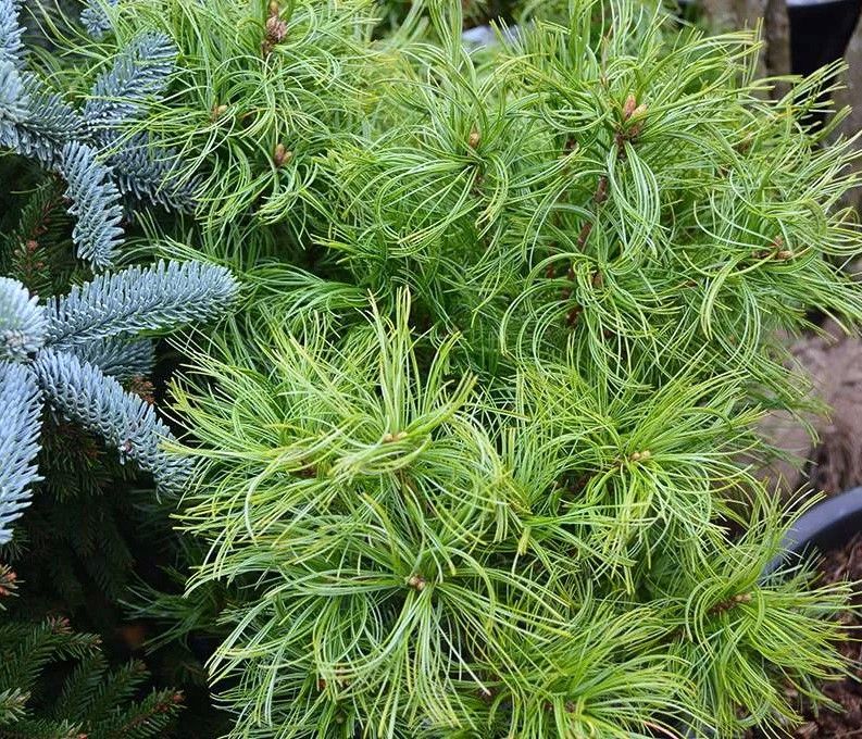 Сосна веймутова «Тини Кёрлс» (Pinus strobus Tiny Curls) — карликовое растение с закрученными трёхгранными хвоинками. Крона — конусовидная, ажурная.