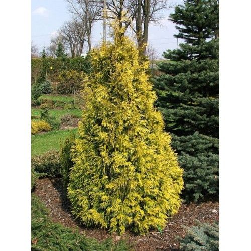 Туя западная 'Holmstrup Yellow' (Thuja occidentalis 'Holmstrup Yellow') — это популярный медленнорастущий сорт с плотной, узкоконической кроной и яркой желтой хвоей, которая сохраняет свой цвет круглый год.