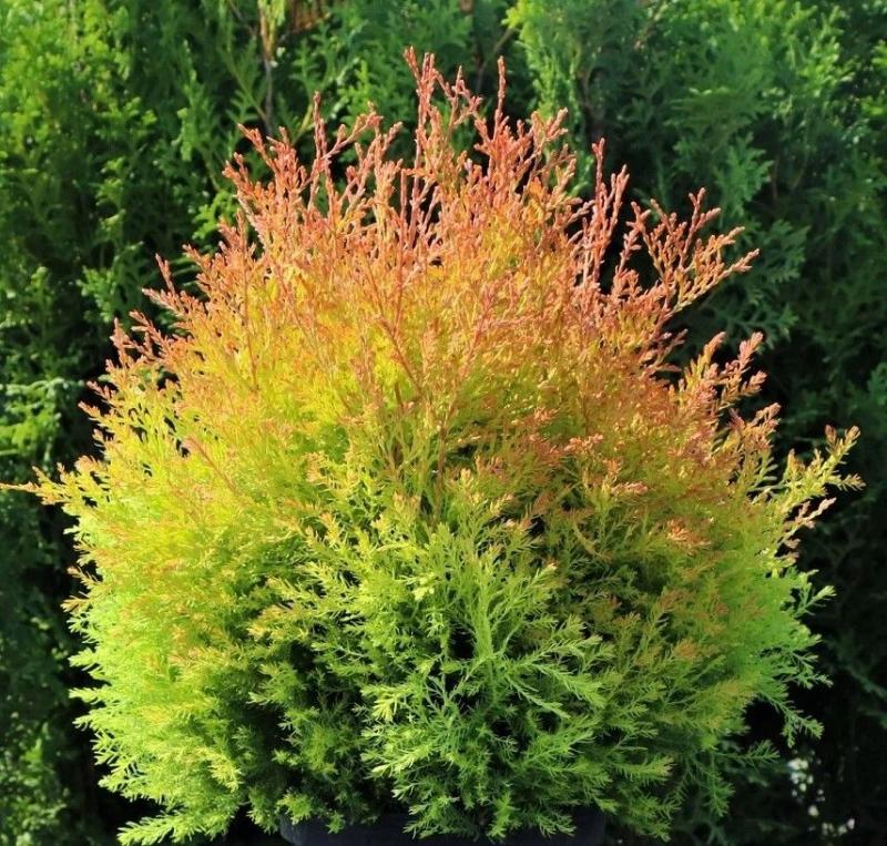 «Файер Чиф» (Fire Chief) — компактный сорт западной туи, отличающийся яркой окраской хвои и округлой формой кроны. Размеры: