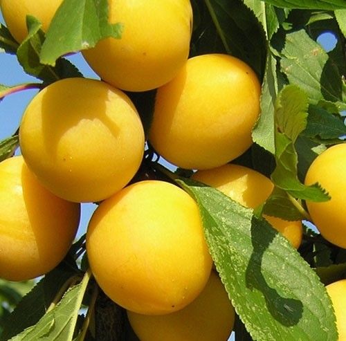 Плоды: крупные, массой около 23–25 грамм, форма округлая, слегка сплюснутая. Кожица плотная, жёлтая с восковым налётом. Мякоть сочная, рыхлая, кисло-сладкого вкуса с нотками винограда. Косточка среднего размера, отделяется с трудом.