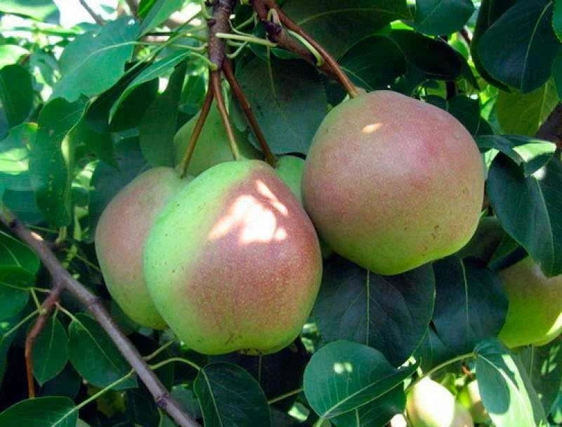 Груша Десертная зимняя. Плоды крупные, зеленовато-жёлтые, при полном созревании — золотисто-жёлтые с сеточкой, хранятся до февраля-марта, что большая редкость среди груш.