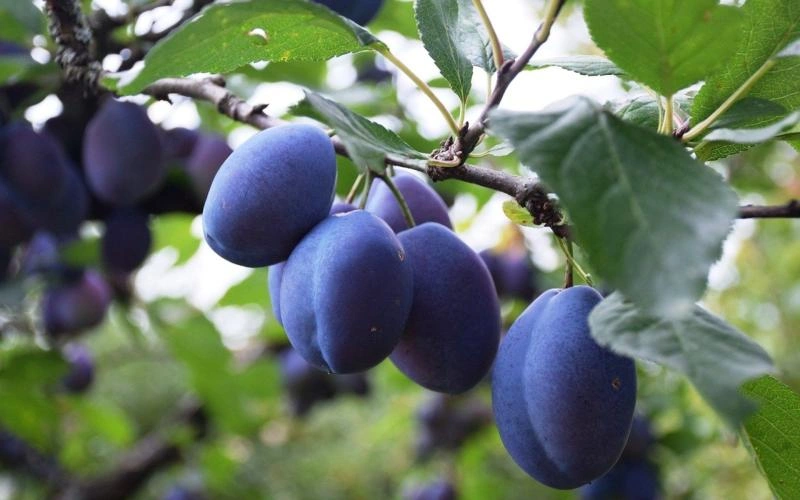 Плоды средние (28 г), сине-фиолетовые, с густым налётом. Мякоть сочная, нежная, сладкая. Косточка свободно отделяется от мякоти.