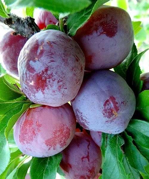 Плоды крупные (до 40 г), округлые, с гладкой поверхностью, на которой выражен матовый налёт и выраженный шов. Спелые сливы тёмно-бордовые, а на этапе технической зрелости — ярко-оранжевые. Кожица у плодов умеренной плотности, не жёсткая. Мякоть жёлто-оранжевая, плотная, мясистая и сочная с хрустинкой. Во вкусе доминирует сладость, с едва заметной кислинкой, которые гармонично сочетаются с сильной пряностью. Аромат у слив выраженный, фруктовый. Урожайность у сорта отличная: от 26 до 45 кг с 1 дерева за сезон. Слива самобесплодна, поэтому нуждается в деревьях-опылителях. Рекомендуется применять в этом случае сливовый сорт «Гигант» или диплоидную алычу.