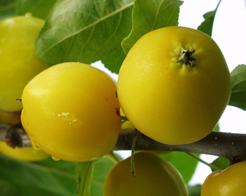 Плоды мелкие, янтарно-желтые, без покровной окраски, на коротких плодоножках, с низкими товарными качествами. Масса плода достигает 30 г. Мякоть плодов желтоватая, кисловатая.