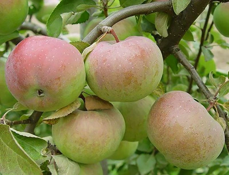 Плоды плоскоконические, встречаются ассиметричные экземпляры. Окраска основная – зеленовато-желтая, покровная — в виде размытого буровато-красного румянца. Кожица плода средней плотности, гладкая, маслянистая, имеет легкий восковой налёт. Мякоть плода зеленовато-белая, плотность средняя, аромат выражен слабо, вкус кисло-сладкий.