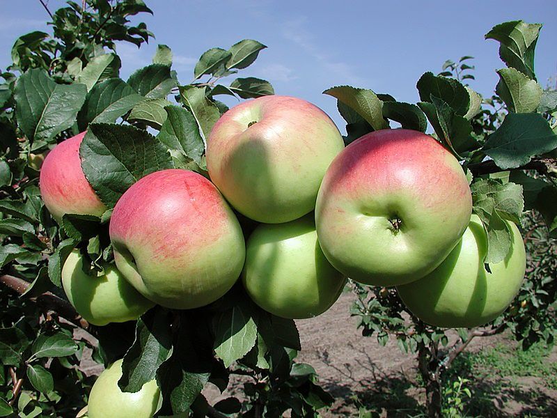 Плоды: Крупные (средний вес 160–200 г), овальной или округло-овальной формы. Основной окрас желто-зеленый, покровный — в виде размытого красного румянца.