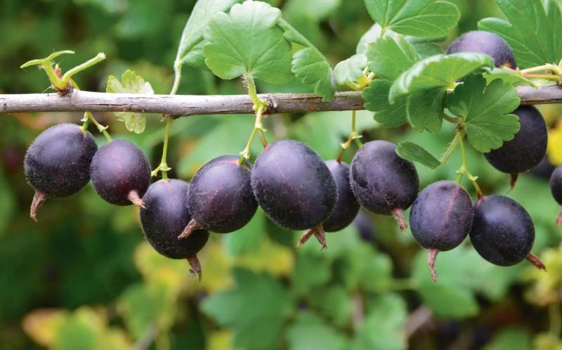 Крыжовник Черномор представляет собой сильнорослый кустарник, набирающий высоту до 150 см. Куст не очень раскидистый, больше сжатый, с сильно загущенной кроной темно-зелеными блестящими листьями и пряморастущими побегами. Ошипованность куста слабая – одинарные колючки сосредоточены в нижней части побега.Среднеплодный вид, масса ягод которого составляет 3 г. Форма у ягод правильная – овальная с гладкой поверхностью, без выраженной опушки. Спелые ягоды имеют необычный окрас – насыщенно-черный с восковым налетом. На этапе технической зрелости крыжовник равномерно покрыт темно-красным окрасом. Жилкование у ягод слабое, а при полном созревании практически незаметное. Кожура у плодов средней плотности, прочная, не жесткая. Прочность кожуры предупреждает растрескивание ягод и позволяет осуществлять механизированный сбор урожая.