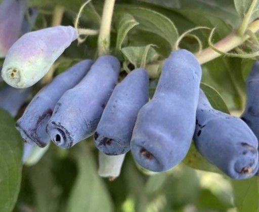 Ягоды: крупные, длиной около 2 см, плотные, тёмно-синие, с сизым восковым налётом. Мякоть плотная, волокнистая, нежная, сладкая с небольшой кислинкой.