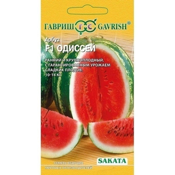 Ранний (73-85 дней от полных всходов до первого сбора плодов) крупноплодный продуктивный гибрид для выращивания в открытом грунте в средней полосе и на юге России. Растение плетистое, с длинной главной плетью. Плоды овальные, светло-зеленые с темно-зелеными полосами, массой 10-14 кг, с прочной корой. Мякоть темно-красная, плотная, сочная, с высоким содержанием сахара, не растрескивается даже у крупных плодов. Гибрид очень надежен и неприхотлив, повсеместно дает высокие урожаи. Обладает устойчивостью к фузариозу и антракнозу. Плоды красивые, одинакового размера, прекрасно хранятся и транспортируются, не подвергаются солнечным ожогам благодаря тому, что хорошо укрыты листьями Посев на рассаду производят в конце апреля. Высадку рассады в грунт — в конце мая – начале июня в возрасте 30-35 дней. Растения подвязывают к шпалере (до высоты 50 см), удаляют все боковые побеги, последующие прищипывают над 1-3 листом или выращивают в расстил.
