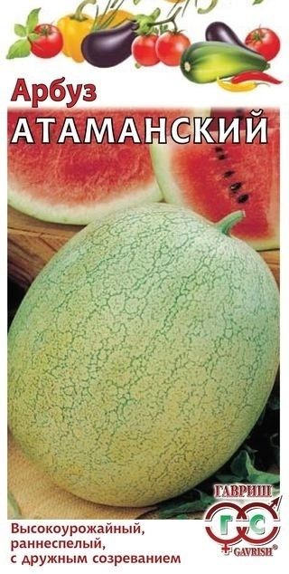 Высокоурожайный раннеспелый (период от полных всходов до первого сбора 68-88 дней) сорт. Растение средней мощности, среднеплетистое. Плод округло-эллиптический со светло-зеленой корой, гладкий, массой 3-3,6 кг. Мякоть интенсивно красная, зернистая, нежная и очень сладкая. Вкусовые качаества отличные. Засухоустойчив, слабо восприимчив к фузариозу и антракнозу. Предназначен для выращивания в пленочных теплицах и в открытом грунте. Посев на рассаду производят в конце апреля. Высадку рассады в грунт— в конце мая – начале июня в возрасте 30-35 дней. Растения подвязывают к шпалере (до высоты 50 см), удаляют все боковые побеги, последующие прищипывают над 1-3 листом или выращивают врасстил. Товарная урожайность 3,0-3,5 кг/м2.