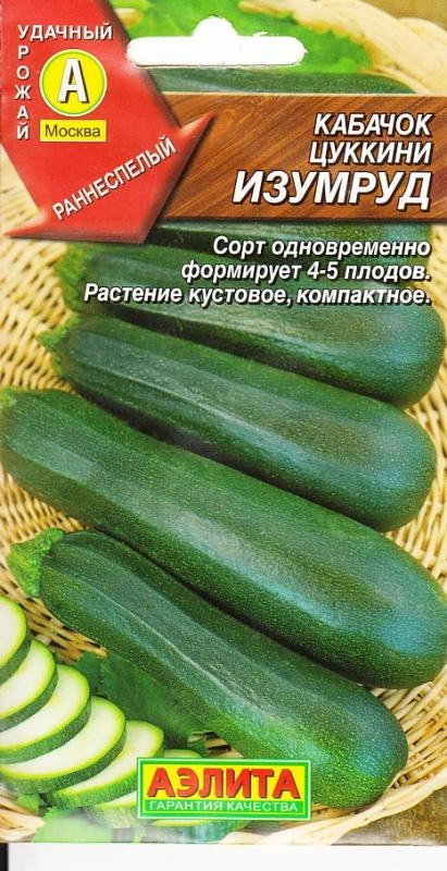 Раннеспелый сорт, от всходов до первого сбора 45 дней. Растение кустовое, компактное. Плод цилиндрический, зеленый с мелкими точками, средней длины и диаметра. Мякоть плотная, с богатейшим по составу витаминно-минеральным комплексом, с нежным приятным вкусом. Одновременно формирует 4-5 плодов, массой 0,3-1,3 кг. Ценность сорта: раннее и дружное формирование урожая, отличные вкусовые качества плодов.