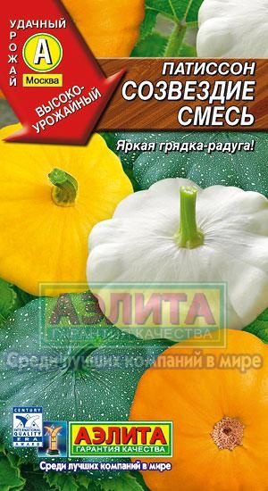 Смесь раннеспелых сортов (период от всходов до начала плодоношения 42-45 дней). Растения кустовые. Плоды дисковидные, выровненные, массой 0,4-0,5 кг. Поверхность гладкая, окраска: белая, желтая, оранжевая и темно-зеленая. Кора тонкая, мякоть белая. Плоды в молодом возрасте пригодны для цельноплодного консервирования и всех видов домашней кулинарии. Посев в пленочные укрытия – в начале мае, в открытый грунт- в конце мая, когда почва прогреется до 13-14⁰С. Семена высевают в лунки по 2-3 шт. на глубину 3-4 см. После появления всходов слабые растения необходимо удалить. Применяют также рассадный способ выращивания. В начале июня рассаду с 2-3 настоящими листьями высаживают по одному растению в лунку.