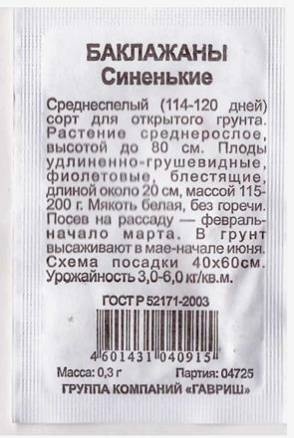 Среднеспелый (110-150 дней от всходов до плодоношения) сорт. Растение компактное, высотой 50-60 см. В средней полосе выращивают под пленкой. В южных регионах выращивают в открытом грунте прямым посевом в апреле-мае. Плоды цилиндрической формы, длиной 14,5-17,5 см, темно-фиолетовые, с глянцевой поверхностью, массой 100-170 г. Мякоть зеленовато-белая, плотная, без горечи. Вкусовые и технологические качества отличные. Характеризуется ранним и дружным ветвлением, что способствует формированию более высокого раннего урожая. Урожайность 3-8 кг/м2.