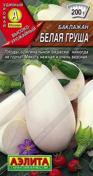 Высокоурожайный, среднеспелый сорт с редкой окраской плодов и абсолютным отсутствием горечи. От высадки рассады до первого сбора 50-60 дней. В средней полосе рекомендуется для пленочных укрытий, в южных регионах – для открытого грунта. Растения компактные, высотой 50-60 см. Плоды длиной до 20 см, массой 180-200 г, с тонкой кожицей, с белой нежной мякотью и почти без семян. Они обладают более приятным и мягким вкусом (по сравнению с обычными темноокрашенными баклажанами), напоминающим куриное мясо или шампиньоны. Прекрасно подходят для тушения, запекания и консервирования. Урожайность – 7-8 кг/м2